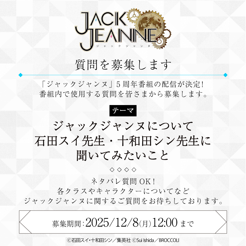 番組内で使用する『ジャックジャンヌについて石田スイ先生・十和田シン先生に聞いてみたいこと』を皆さまから募集しますので、下記WEBフォームからお送りください。